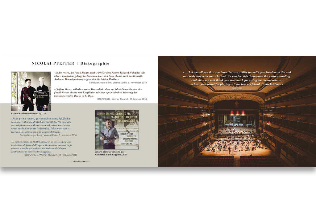 Dies sind einige Beispiele für schöne Presskits für den Klassik-Bereich, die unter Anderem für bekannte SängerInnen und Interpreten wie Anna Netrebko, Rolando Villazon, Bryn Terfel, Lang Lang oder Hilary Hahn gefertigt wurden – für gezielte und haptisch erlbbare Print-Promotion. Bis heute aktuell: Für Klarinettist Nicolai Pfeffer / Label Novantiqua s.u.
